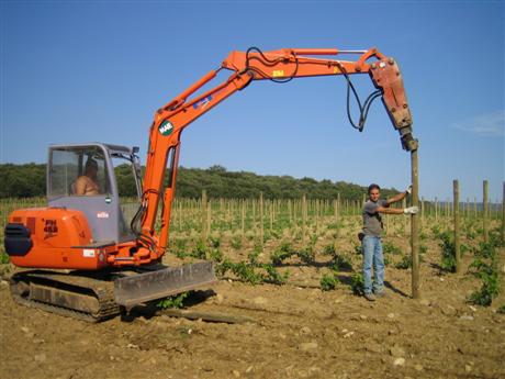 Messa a dimora di pali intermedi di pino trattato (particolare) - Azienda Camillano Diffusione S.r.l., Moltacino (Toscana).
